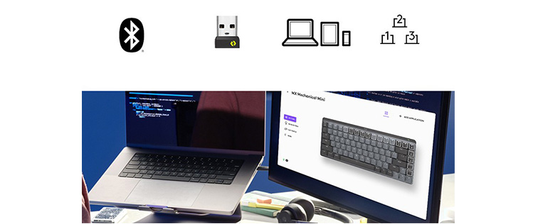 Logitech MX Mechanical có thể kết nối với máy tính của bạn thông qua Bluetooth hoặc USB Receiver. Chỉ cần cắm vào cổng USB trên PC hoặc MAC thì bàn phím có thể hoạt động ngay lập tức.