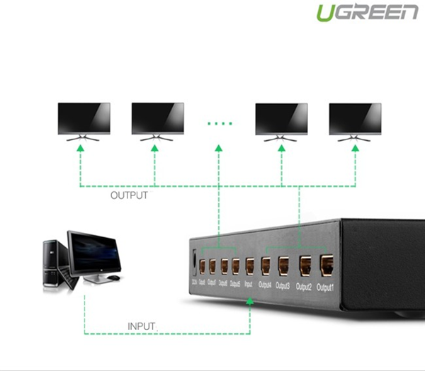 Bộ chia HDMI 1 ra 8 hỗ trợ Full HD 1080P Ugreen 40203 giúp bạn chia tín hiệu từ các thiết bị hỗ trợ HDMI như: DVD, truyền hình vệ tinh, cáp Box, PC, Xbox, PS3… ra 8 màn hình khác nhau giúp bạn thưởng thức những bộ phim sống động, chân thực nhất.