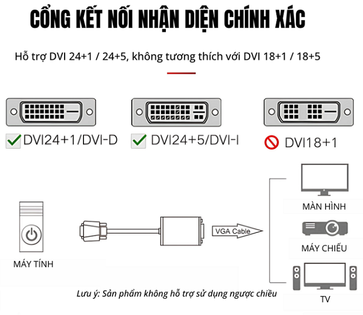 Tương thích rộng: Dễ dàng kết nối máy tính, PC, card đồ họa có cổng DVI sang màn hình, máy chiếu VGA.