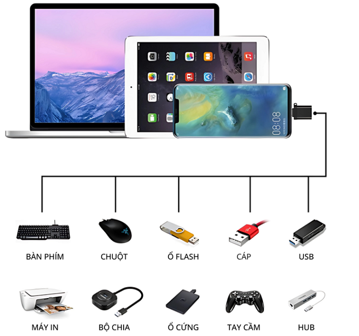 Hỗ trợ truyền dữ liệu và kết nối nhanh chóng cho điện thoại, máy tính bảng, laptop và phụ kiện ngoại vi.