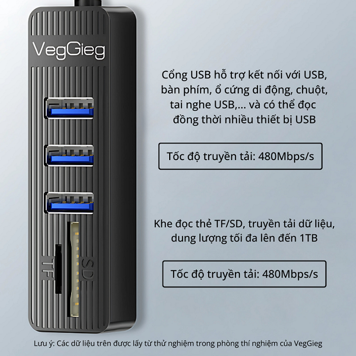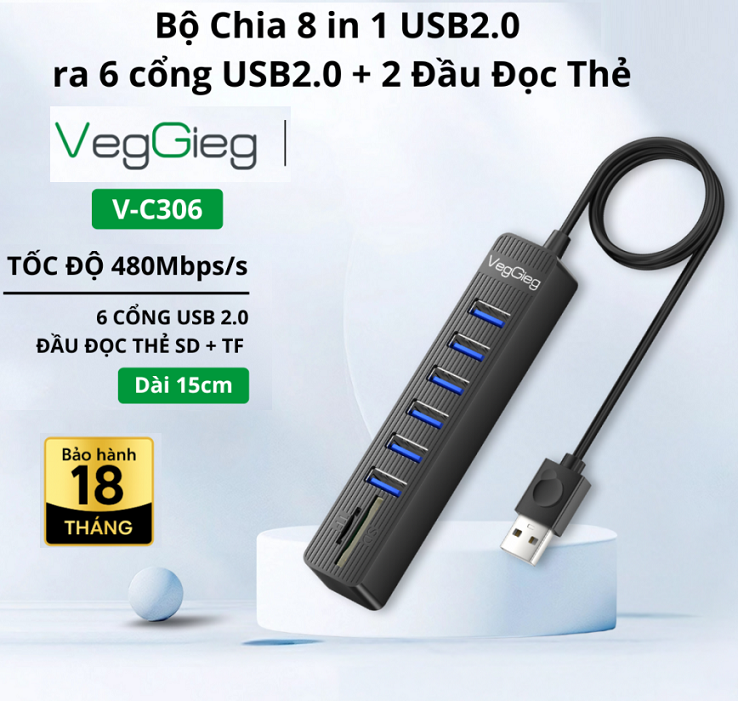 Bộ Chia/Hub USB 2.0 ra 6 cổng + Đầu Đọc Thẻ (SD + TF 2 in 1) VegGieg V-C306