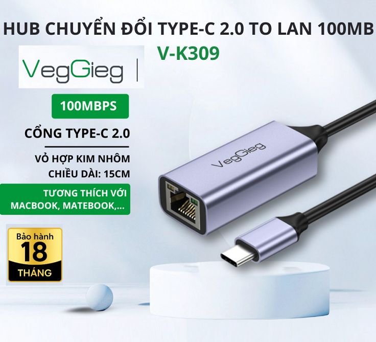 Bộ Chuyển Đổi Type-C 2.0 Sang LAN VegGieg V-K309 - 100Mbps