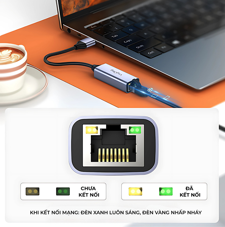 Biến cổng Type-C 2.0 thành cổng mạng LAN RJ45, giúp laptop hoặc thiết bị không có cổng mạng dễ dàng kết nối Internet có dây.