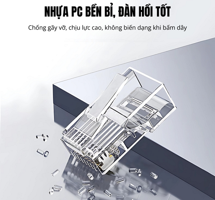 Độ bền cao: Nhựa PC trong suốt, dẻo dai, không dùng nhựa tái chế, giúp đầu bấm bền chắc trong môi trường thi công.