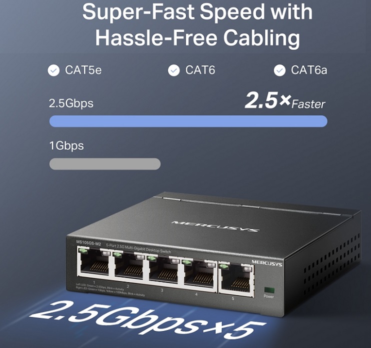 | Bộ Chia Mạng Mercusys MS105GS-M2 Loại 5 Cổng Gigabit 2.5G Vỏ kim loại | ||||