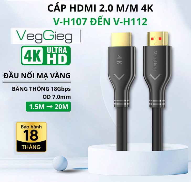 Dòng cáp HDMI 2.0 VegGieg V-H109 → V-H112 được thiết kế tối ưu cho nhu cầu kết nối các thiết bị giải trí và làm việc: TV, máy chiếu, đầu phát Blu-ray, laptop, PC, máy chơi game... Với chất lượng hình ảnh 4K sắc nét, băng thông 18Gbps và đầu kết nối mạ vàng 24K, sản phẩm mang lại trải nghiệm truyền tải nhanh – ổn định – trung thực.