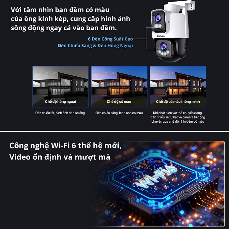 Tenda CH9-WCA là camera giám sát ngoài trời hiệu suất cao, tích hợp hai ống kính với độ phân giải tổng cộng 6MP (3MP + 3MP), cung cấp góc nhìn 360° và tầm nhìn ban đêm Full-Color. Thiết bị hỗ trợ phát hiện con người và phương tiện bằng AI, âm thanh hai chiều, cảnh báo âm thanh và ánh sáng, cùng khả năng kết nối Wi-Fi 6 ổn định, phù hợp cho việc giám sát sân vườn, trang trại và cửa hàng.