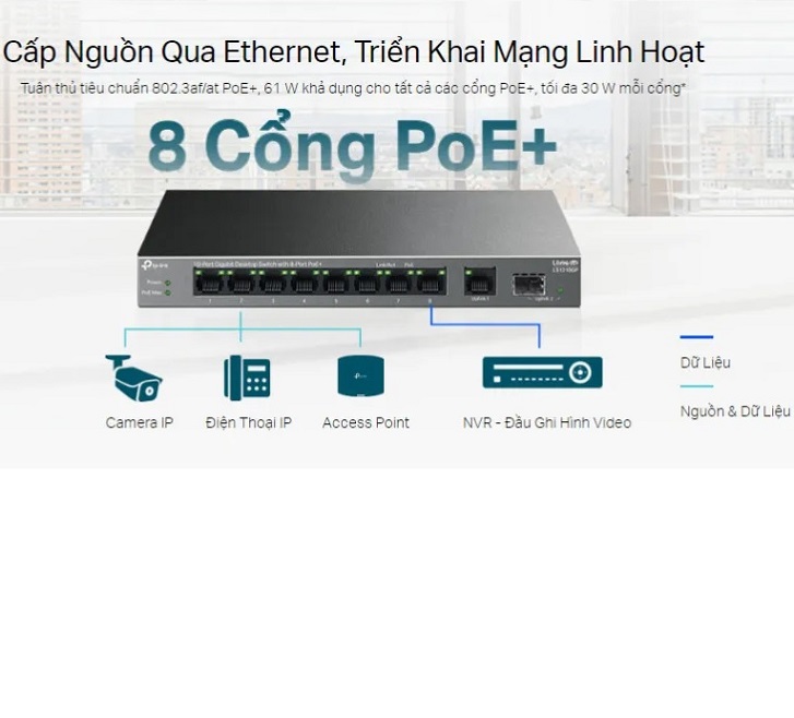 (9) cổng RJ45 1GbE: có 8 cổng cấp PoE+ 802.3af/at công suất 30W mỗi cổng