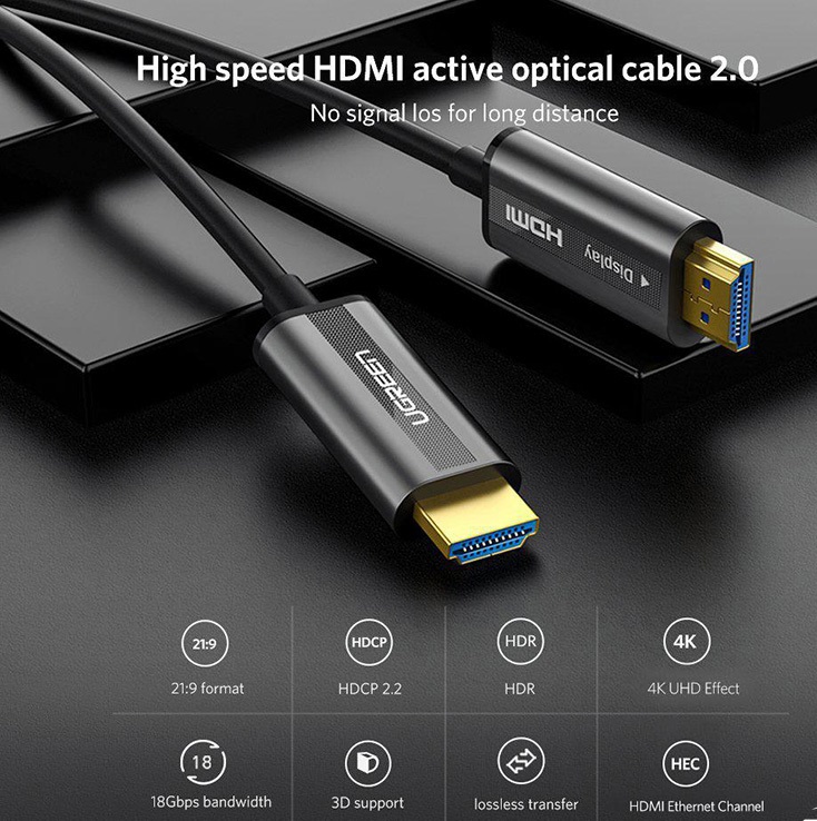 Ugreen 50219 chuẩn HDMI 2.0 sợi quang cao cấp chuyển đổi tín hiệu điện thành quang đảm bảo truyền tín hiệu không bị suy giảm ngay cả với dây có độ dài lớn