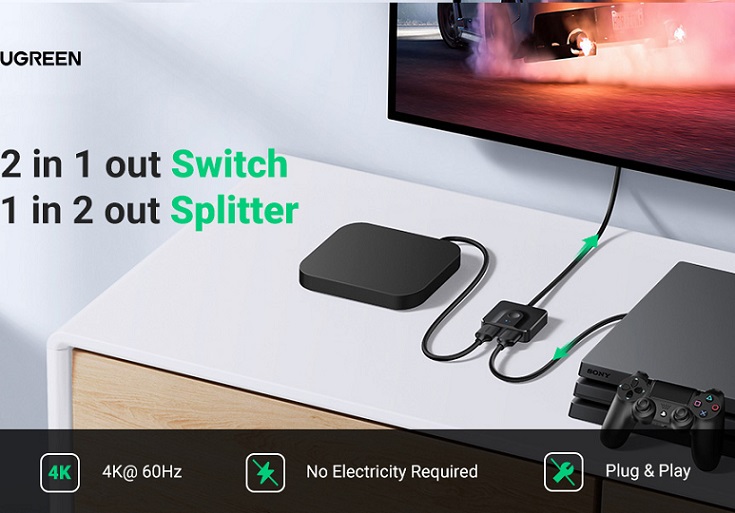 Bộ gộp tín hiệu HDMI 2.0 4K@60Hz Splitter Switch 2 vào 1 Ugreen 70607 (hỗ trợ 2 chiều)