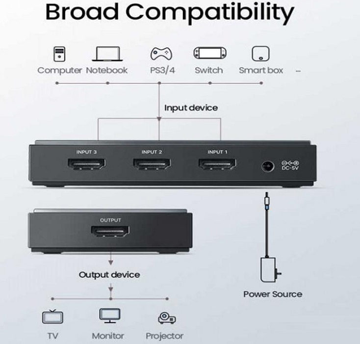 Bộ gộp HDMI 2.0 3 vào 1 Ugreen 50709 hỗ trợ phân giải 4K2K@60Hz sử dụng để gộp 3 thiết bị hỗ trợ cổng HDMI như: máy tính, Macbook, TV box, đầu DVD, Playstation 3 (PS3)…vào 1 màn hình TV hoặc máy chiếu hiển thị hình ảnh.