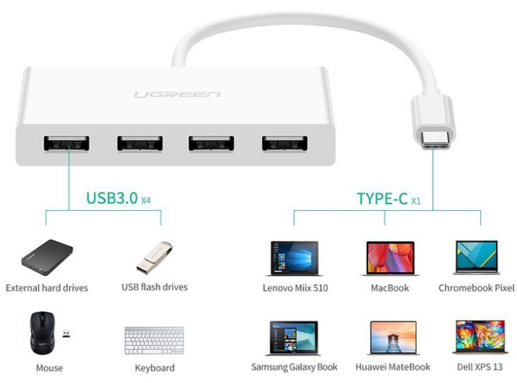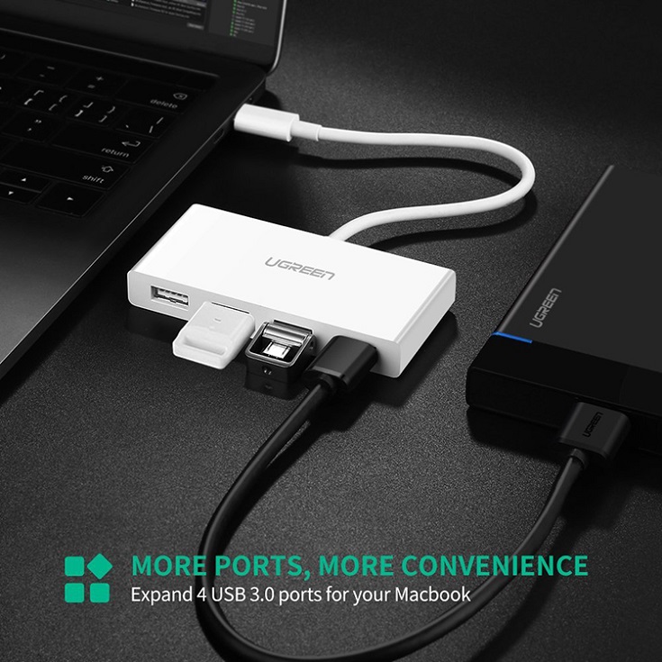 Cáp Ugreen 40379 với chức năng chuyển đổi cổng USB Type C trên máy tính Laptop, Macbook sang 4 cổng USB 3.0 kết nối bàn phím, chuột và các thiết bị ngoại vi sử dụng cổng USB dễ dàng. Sử dụng đơn giản, chỉ cần cắm và dùng, không cần cài đặt.