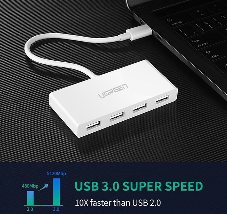 Cáp USB Type C to USB 3.0 chia 4 cổng Ugreen 40379 sử dụng kết nối USB 3.0 cho tốc độ kết nối lên tới 5Gbps, truyền dữ liệu và tín hiệu đến các thiết bị 1 cách nhanh chóng và đảm bảo.