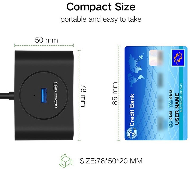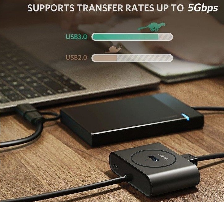 Bộ chia USB 3.0 4 cổng + USB Type C Ugreen 40850 có chức năng biến 1 cổng USB 3.0 thành 4 cổng USB 3.0 , cho phép máy tính của bạn kết nối với 4 thiết bị chuẩn USB như chuột, bàn phím, HDD box, đầu đọc thẻ….Sản phẩm rất tiện lợi cho những chiếc máy tính, Macbook có ít hoặc chỉ có 1 cổng USB.