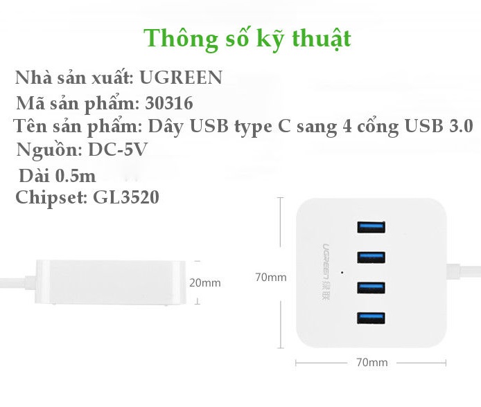 Đặc điểm kĩ thuật cáp USB Type C 3.1 to Hub 4 Port USB 3.0 Ugreen 30316