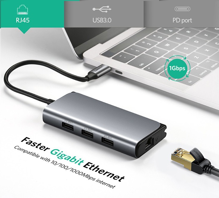 Bộ chuyển đổi USB Type C to LAN 100/1000Mbps kèm HUB 3 cổng USB 3.0 Ugreen 50252 | ||||