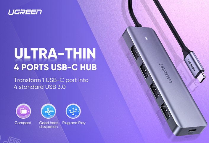 Bộ chia USB Type C 4 cổng USB 3.0 Ugreen 70336 mở rộng USB Type C được tích hợp trong chip chức năng OTG, nó có thể dễ dàng kết nối chuột, bàn phím, đĩa USB và các thiết bị USB khác với điện thoại và máy tính bảng USB-C của bạn. Thiết bị có kèm một cổng USB-C hỗ trợ bù nguồn trong một số trường hợp cần sử dụng dòng điện lớn như ổ cứng di động, cáp máy in, cáp USB kéo khoảng cách dài.