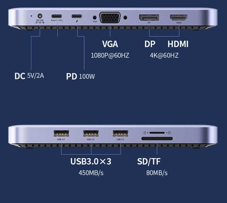 Tính năng chính Hub USB Type C 11 in 1 to HDMI, VGA, Displayport, USB 3.0, đọc thẻ SD/TF hỗ trợ sạc USB C:
