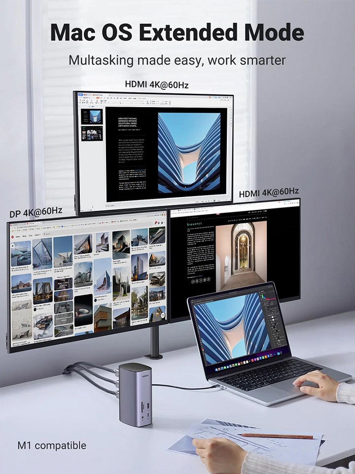 Mở rộng ba màn hình: Với công nghệ DisplayLink, UGREEN USB C Docking Station hỗ trợ mở rộng 3 màn hình cho các hệ thống Windows và macOS.