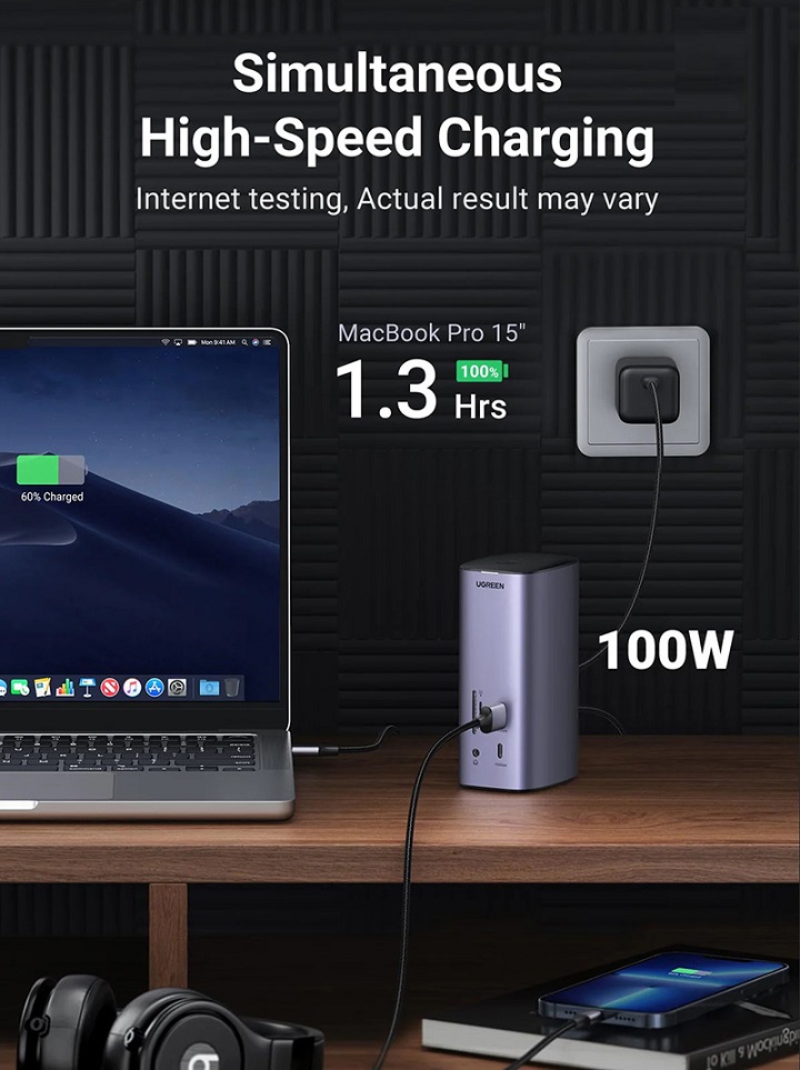Nó có thể đáp ứng nhu cầu truyền dữ liệu của bạn trong thời gian rất ngắn, tiết kiệm đáng kể thời gian chờ đợi của bạn. Sạc nhanh PD 100W: Đế cắm máy tính xách tay 12 trong 1 được trang bị cổng sạc PD 3.0 100W. Chỉ mất 1,5 giờ để sạc đầy Macbook Pro 15” mà không chiếm dụng một cổng nào khác của máy tính xách tay. (Không bao gồm bộ sạc)