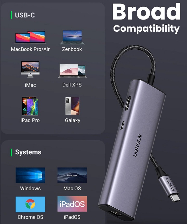 Bộ chia USB-C Ugreen 90568 đi kèm với cổng HDMI, có thể kết nối máy tính xách tay của bạn với màn hình hoặc màn hình để truyền video ít bị lag hoặc giật hơn, hiển thị một thế giới sống động cho bạn.