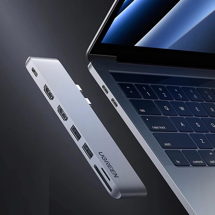 Bộ chuyển đổi USB Type C Ugreen 80548 giúp mở rộng cổng kết nối cho laptop của bạn với 2 đầu ra video HDMI, 2 USB 3.0, đọc thẻ SD và TF, cổng sạc USB Type C PD 100W.