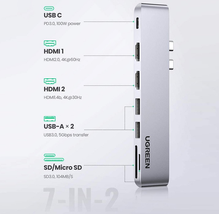 Tính năng HUB USB Type C sang 2 HDMI, USB 3.0, đọc thẻ SD/TF hỗ trợ sạc PD 100W USB C Ugreen 80548