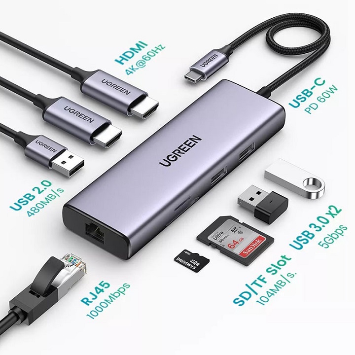 Tính năng HUB USB Type C to 2 HDMI, USB 3.0, Lan, Sạc PD, đọc thẻ SD/TF Ugreen 90119: