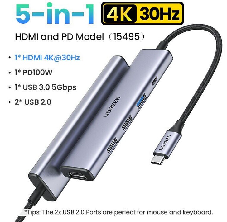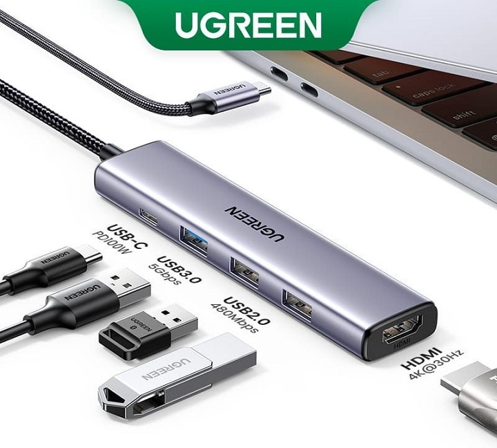 HUB USB-C sang 2*USB-A 2.0, USB-A 3.0, HDMI 4K@30Hz, PD 100W Ugreen 15495 | ||||