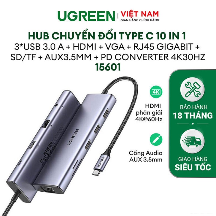HUB 10 in 1 Ugreen 15601 giúp mở rộng màn hình kép 4K HDMI và VGA 1080P, cổng Ethernet 1Gbps, cổng sạc USB-C 100W PD, 3 cổng USB-A 3.0, giắc cắm 3,5MM và đầu đọc thẻ SD/TF.
