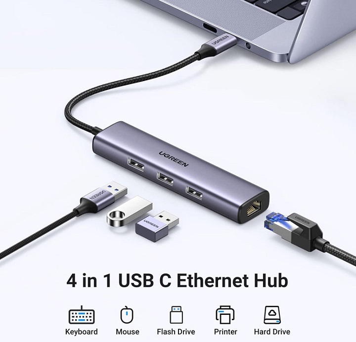HUB chia USB-C sang 3 cổng USB 3.0 kèm LAN Gigabit vỏ nhôm Ugreen 60600 | ||||