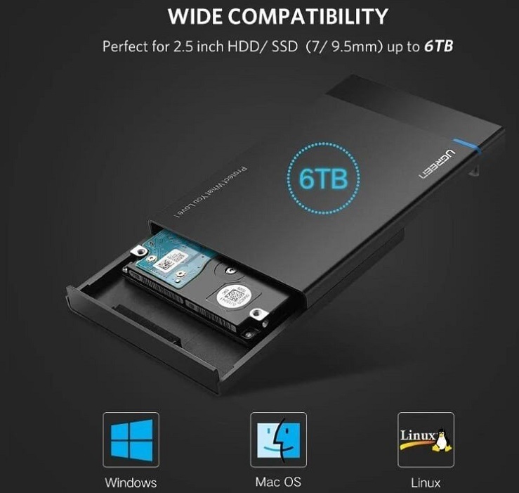 Hộp đựng ổ cứng 2.5inch SATA chuẩn USB-C giao tiếp USB 3.0 Ugreen 50743 cho tốc độ truyền tải dữ liệu cao nhất lên tới 6Gbps, hỗ trợ dung lượng ổ cứng tối đa 6TB.