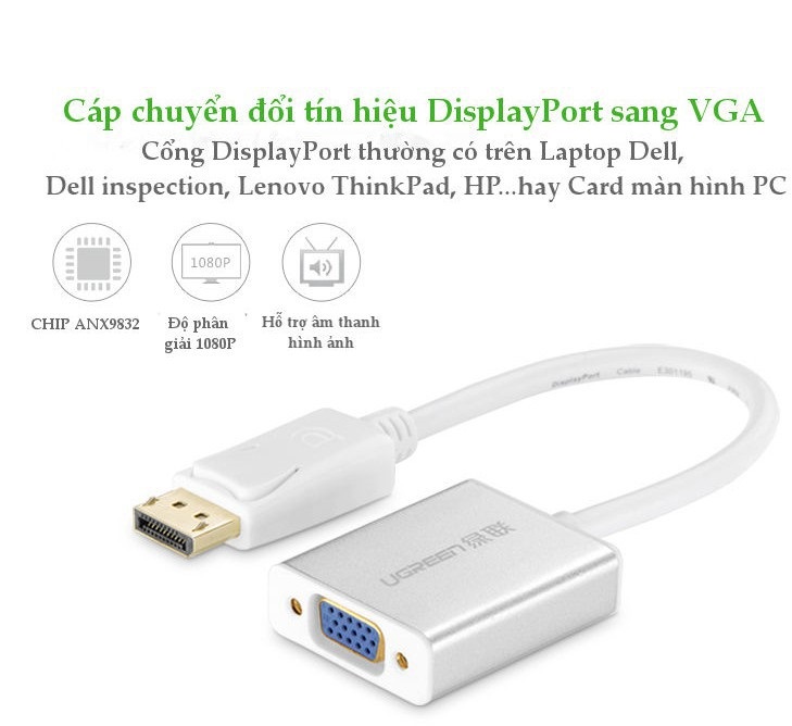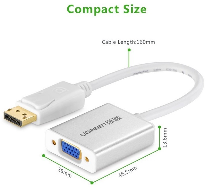 Cáp Ugreen 20412 là bộ chuyển đổi liền mạch giúp bạn kết nối máy tính bảng, macbook pro,… với một DisplayPort tới màn hình TV, LCD, HDTV,.. với giao diện VGA .