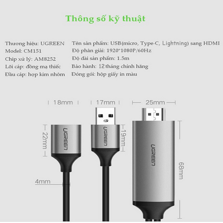 Thông số kĩ thuật Cáp chuyển điện thoại ra tivi HDMI Ugreen 50291