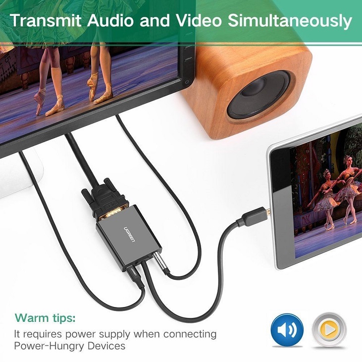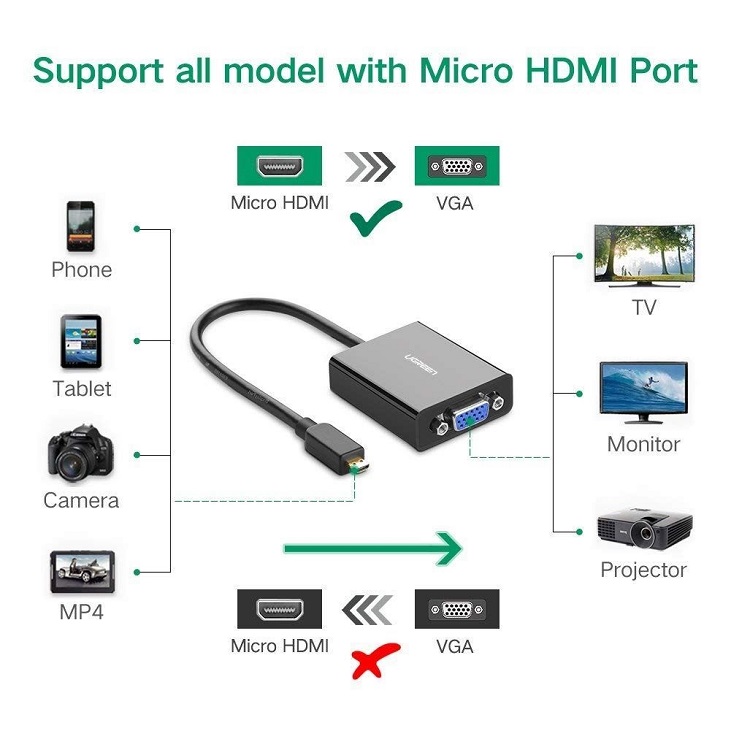 Ugreen 40269 là sản phẩm hỗ trợ kết nối các thiết bị có cổng Micro HDMI như máy ảnh, máy quay, điện thoại… để kết nối với tivi, máy chiếu có hỗ trợ cổng VGA.
