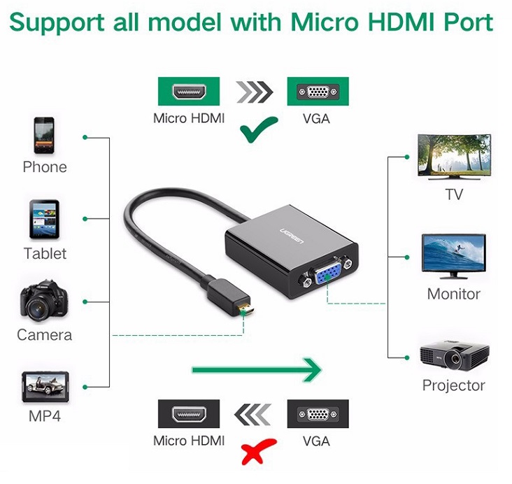Tính năng: chuyển đổi tín hiệu từ Micro HDMI ra VGA (không hỗ trợ chuyển ngược từ VGA ra Micro HDMI)