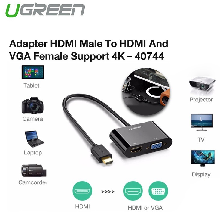 Cáp chuyển đổi HDMI to HDMI/VGA Ugreen 40744 sử dụng để kết nối máy tính, laptop… các thiết bị có cổng HDMI với các thiết bị có cổng VGA/HDMI khác như máy chiếu, HDTV… Cáp Ugreen 40744 sử dụng thêm cổng Micro USB cấp nguồn cho cáp để cáp hoạt động và truyền tín hiệu ổn định hơn.