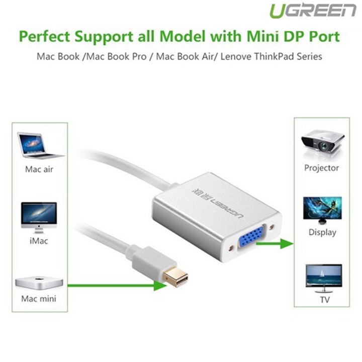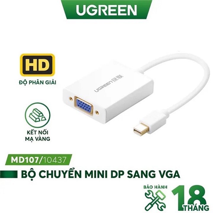 Cáp chuyển Mini Displayport sang VGA Ugreen 10437 chuyển đổi âm thanh hoàn hảo có thể kết nối MacBook, MacBook Pro, hay MacBook Air với một Mini DisplayPort để hiển thị thông thường VGA, chẳng hạn như màn hình CRT, màn hình LCD và máy chiếu để thưởng thức chất lượng âm thanh và video từ rạp hát gia đình của bạn.