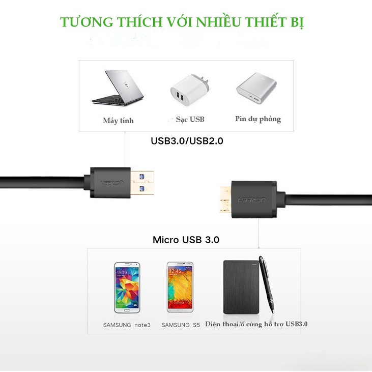 Cáp Ugreen 10841 Micro USB 3.0 kết nối một ổ đĩa cứng di động USB 3.0 với máy tính để truyền tải file nhanh chóng hoặc đồng bộ và sạc điện thoại thông minh Samsung hay tablet trang bị cổng USB 3.0 to Micro-B.