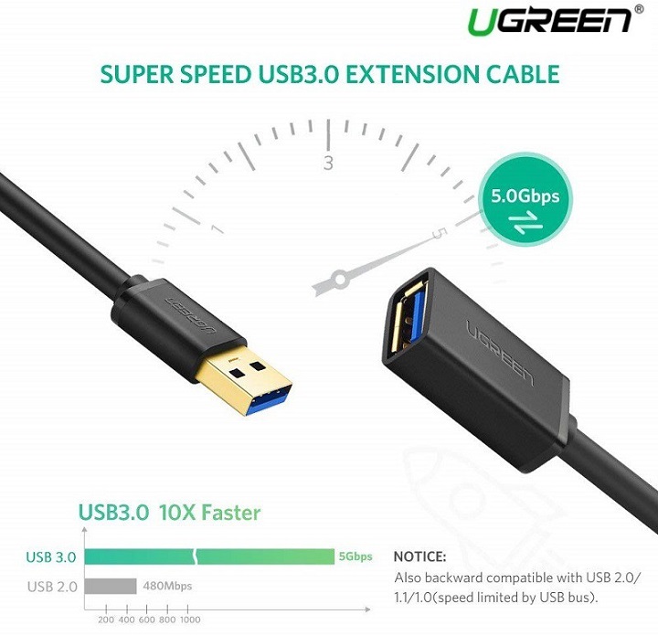 Cáp nối dài USB 3.0 Ugreen 10368 A dương sang âm Extension cho phép bạn mở rộng ổ đĩa flash, ổ cứng, đầu đọc thẻ, USB hub 3.0, máy in, máy ảnh, vv với tốc độ lên đến 5Gbps (Super Speed)