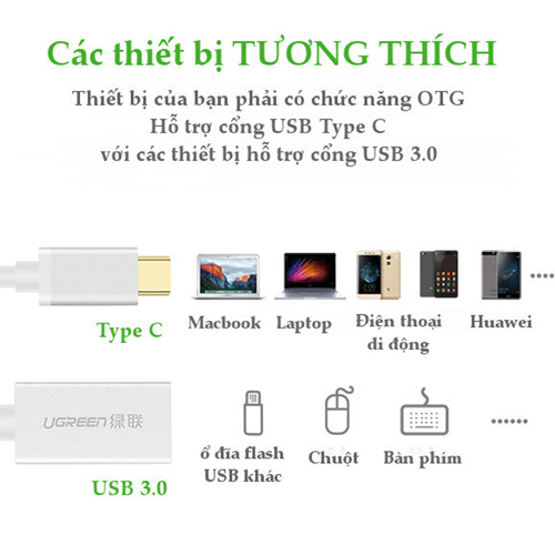Cáp OTG USB Type C sang USB 3.0 chuẩn A cổng âm Ugreen 30645 cho phép bạn kết nối ổ đĩa flash, bàn phím, chuột, hoặc các tiêu chuẩn USB-A thiết bị của bạn với một thiết bị USB Type C như Apple MacBook mới 12, Google Chromebook, Nokia, Huawei…