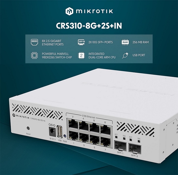 Mikrotik CRS310-8G+2S+IN là sự kết hợp mạnh mẽ giữa tám cổng Ethernet 2,5 Gigabit và hai cổng 10 Gigabit SFP+ trong một thiết bị nhỏ gọn, mạnh mẽ! Hơn nữa, các cổng quang SFP+ hỗ trợ nhiều tốc độ dữ liệu: 1G, 2,5G và 10G. Vì vậy, bạn có thể sử dụng thiết bị như một Switch 10 cổng 2.5G nếu cần (sử dụng với 2 Module S+RJ10).