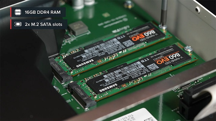 Thiết bị đi kèm RAM 16 GB và hai khe cắm M.2 SATA để bổ sung dung lượng lưu trữ.