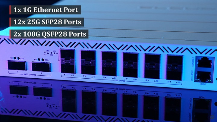 Mikrotik CCR2216-1G-12XS-2XQ có 2 cổng quang QSFP28 tốc độ 100 Gigabit cực nhanh, 12 cổng quang SFP28 cho tốc độ 25 Gigabit và một cổng Gigabit Ethernet.