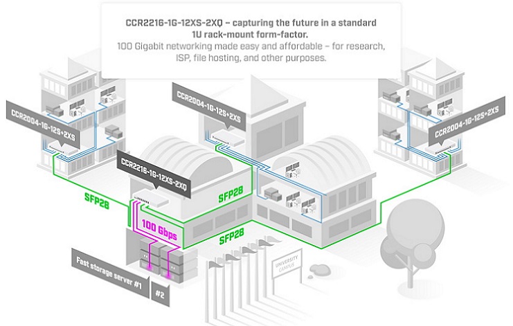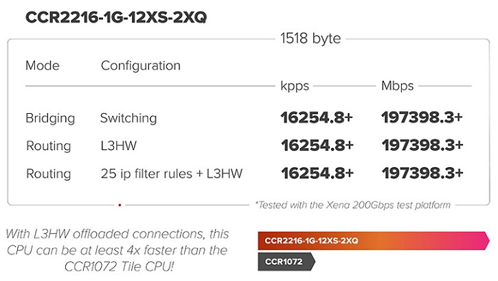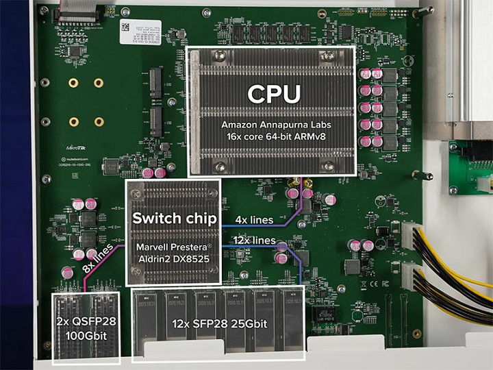 Router CCR2116 trước đây có switch-chip với bốn đường kết nối 10G tới CPU, nhưng với switch-chip của CCR2216 có bốn đường 25G tới CPU!