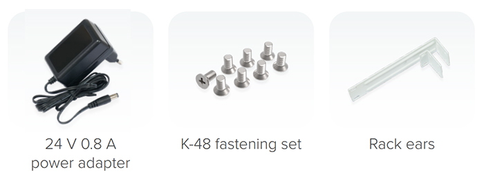 Bao gồm Adaptor nguồn 24V-0.8A, bộ ốc vít K-48, và tai gắn tủ rack.