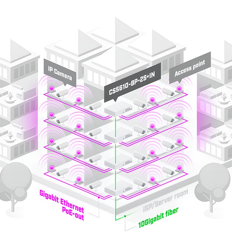 Nhưng điều may mắn thực sự là sự kết hợp giữa cổng Ethernet SFP+ và PoE-out . Với thiết lập này, bạn có thể làm mọi việc với ngân sách eo hẹp. CSS610 có tổng công suất PoE-out ấn tượng là 140W , nên bạn có thể sử dụng ngay cả trong những tình huống khắc nghiệt nhất – như khách sạn, phòng hội nghị hoặc trung tâm cuộc gọi! Sử dụng các cổng PoE-out để kết nối điện thoại IP trong khi các cổng SFP+ kết nối máy chủ chính của bạn với ISP. Hoặc cấp nguồn cho một loạt camera mạng và tải ngay đoạn phim lên đám mây. Và quản lý một nhóm điểm truy cập không dây cùng một lúc. Ngoài ra, khả năng mở rộng không còn là vấn đề nữa. Với mức giá của chúng tôi, bạn có thể mua được một công tắc ở mỗi tầng!