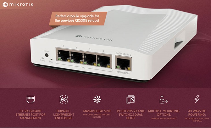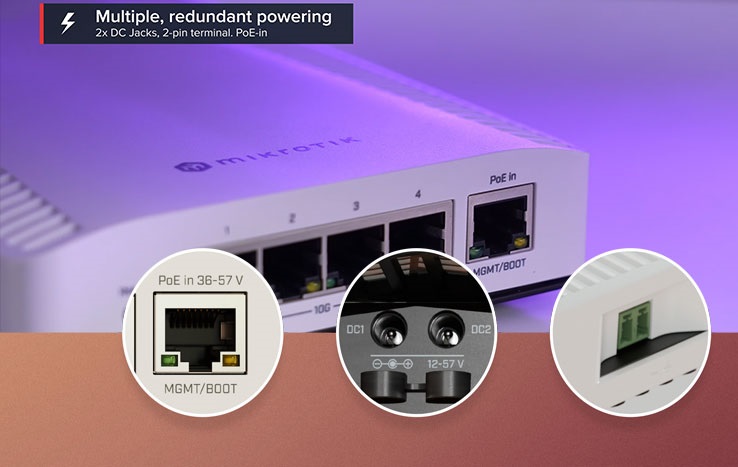 Dự phòng nguồn điện là một tính năng chính của CRS304. Nó cung cấp bốn tùy chọn đầu vào nguồn khác nhau: hai giắc cắm DC, 2-pin terminal và PoE-in. Switch tự động chọn nguồn điện có điện áp cao nhất, đảm bảo hoạt động không bị gián đoạn.