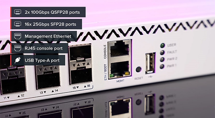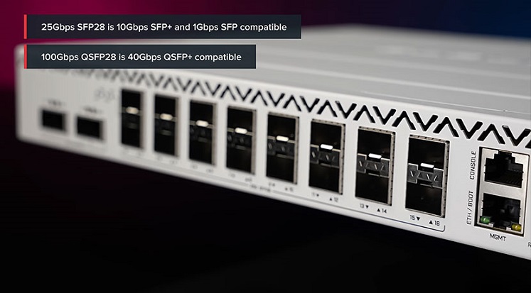 2 cổng QSFP28 100G hỗ trợ nhiều tốc độ: 100G, 2x50G, 1x50G, 1x40G, 4x25G, 4x10G, 4x1G.