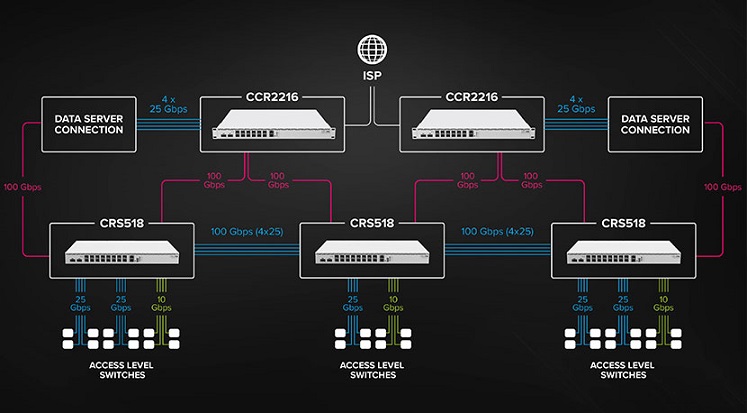 Hệ điều hành RouterOS v7: Hỗ trợ các tính năng quản lý mạng nâng cao như VLAN (802.1Q, 802.1ad), định tuyến phần cứng L3, ACL, LACP, MLAG, IGMP/MLD snooping và khung Jumbo.